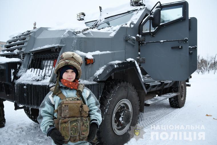 Поліцейські спецпризначенці показали броньовану машину, що використовується під час спецоперацій, продемонстрували засоби індивідуального захисту, оптичні прилади.