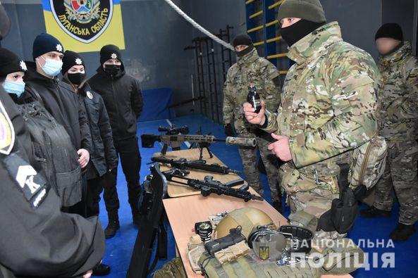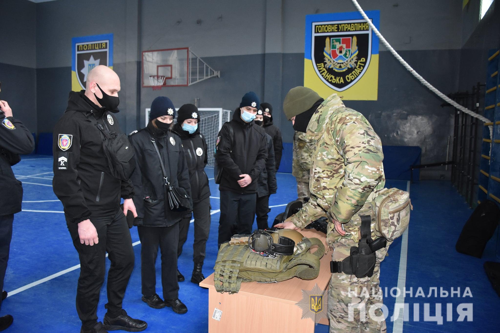Під час заняття молоді поліцейські пройшли психологічні тестування, ознайомились зі зброєю та спецзасобами, що використовують бійці спецпідрозділів, ознайомились з вихонебезпечними предметами, які найчастіше вилучаються поліцейськими на Луганщині, та на власні очі побачили роботу кінолога зі службовим собакою.