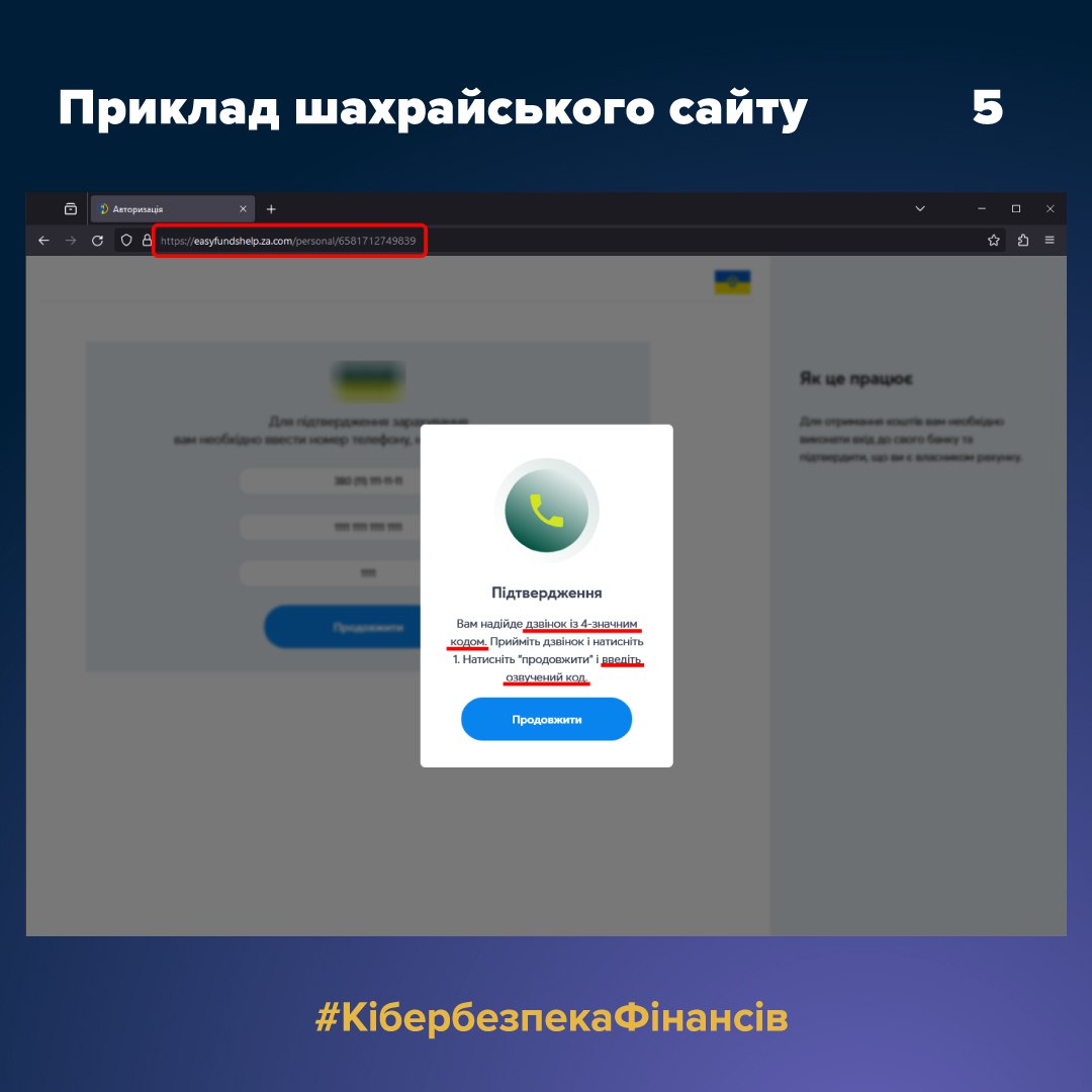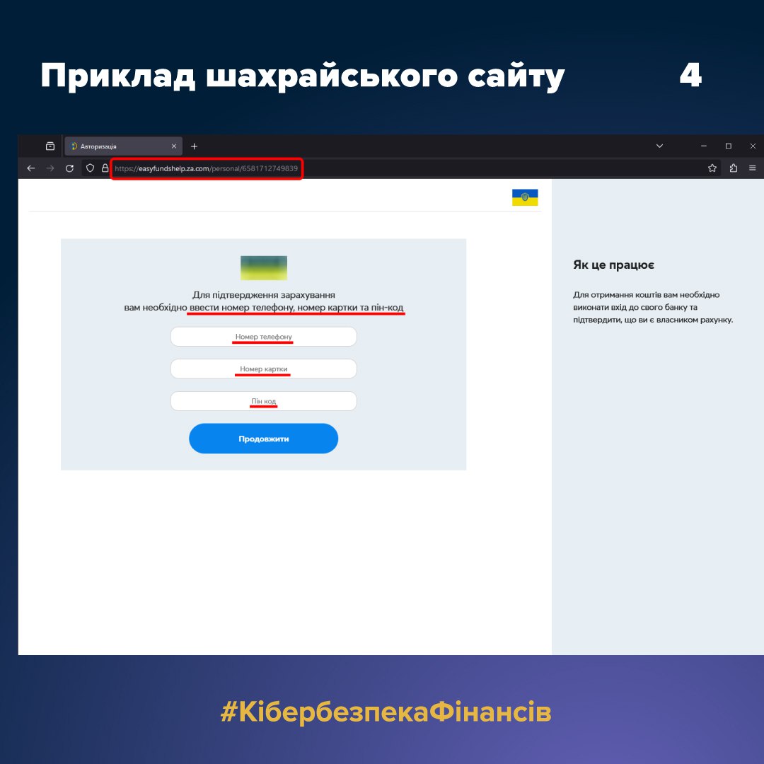 Щоб оформити грошову виплату, шахрайський ресурс пропонував ввести номер мобільного телефону, пароль від особистого кабінету, номер картки, CVV, пін-код та поточний баланс картки для підтвердження входу в особистий кабінет. Отримані дані шахраї використовували для “прив'язкиˮ акаунта користувача до нового пристрою або для онлайн авторизації на порталі відповідного банку, що давало їм змогу вивести кошти з рахунку жертви.