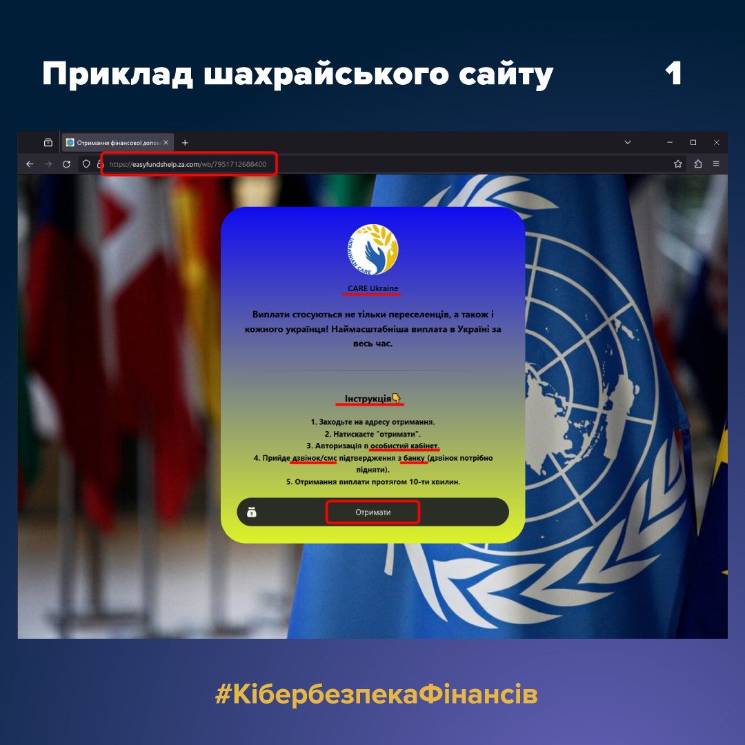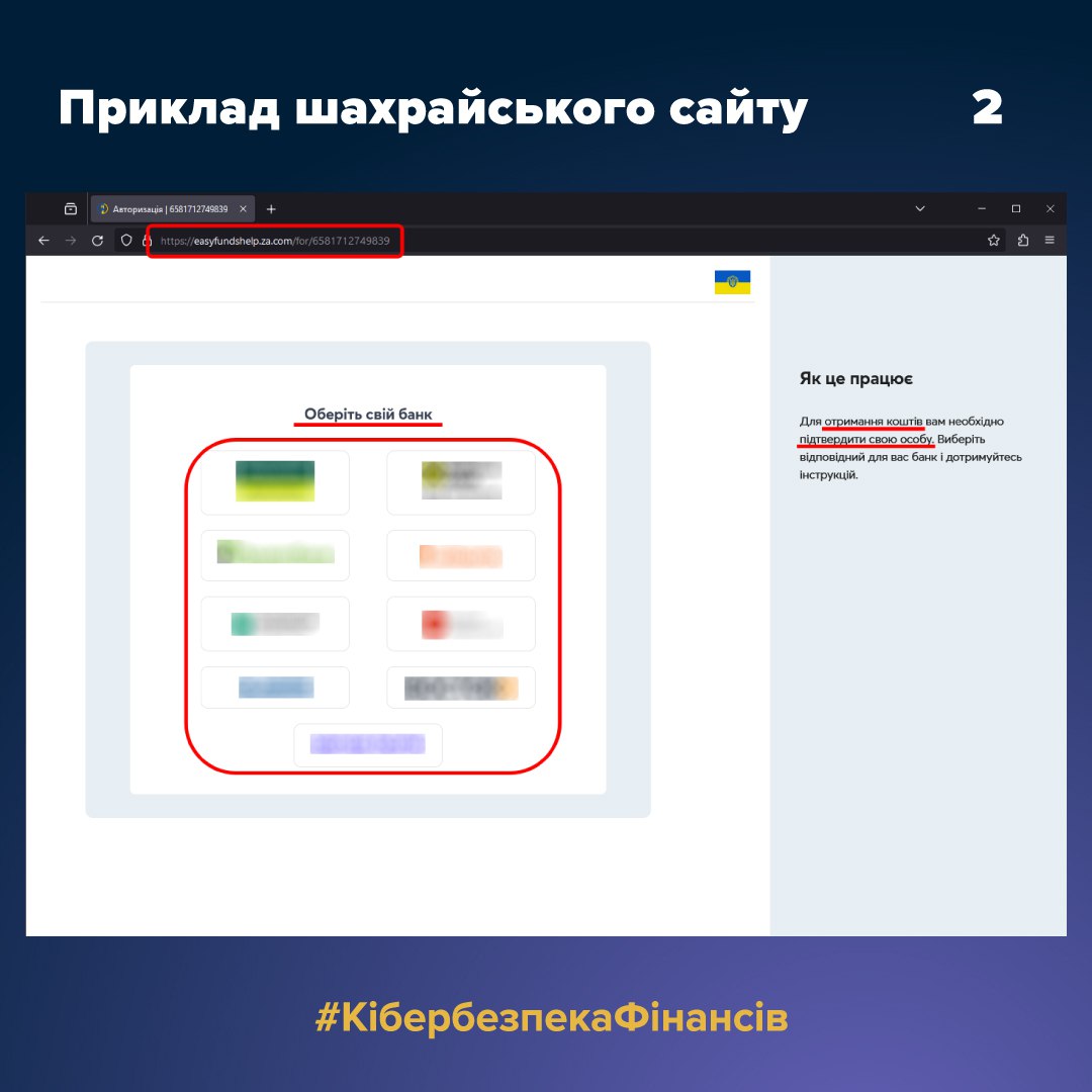 Повідомлення містило активне посилання на фішингову сторінку-приманку, яка була стилізована з використанням айдентики благодійної організації. На цій сторінці шахраї розмістили інструкції щодо проходження ідентифікації, а також активні посилання на шахрайські фішингові ресурси, які маскувалися під сторінки авторизації банків.