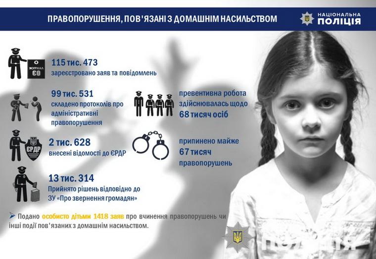 Відтак у рамках протидії домашньому насильству дільничними розглянуто більше 115 тисяч заяв, повідомлень про вчинені правопорушення та інші події, пов’язані з домашнім насильством. Поліцейські здійснювали превентивну роботу щодо 68 тисяч осіб, які вчинили домашнє насильство. У результаті було припинено майже 67 тисяч адміністративних правопорушень, пов’язаних з фактами домашнього насильства.