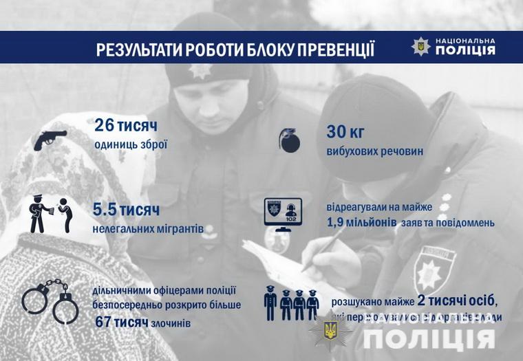 Зокрема, за участі співробітників блоку превенції було виявлено 5,5 тисяч нелегальних мігрантів,вилучено з незаконного обігу 26 тисяч одиниць вогнепальної, травматичної зброї, бойових припасів, а також понад 30 кг вибухових речовин. Крім того, задокументовано 590 фактів незаконних посівів нарковмісних рослин, з незаконного обігу вилучено 60 кг макової соломи та 70 кг марихуани, знешкоджено майже 150 тисяч кущів маку та конопель.