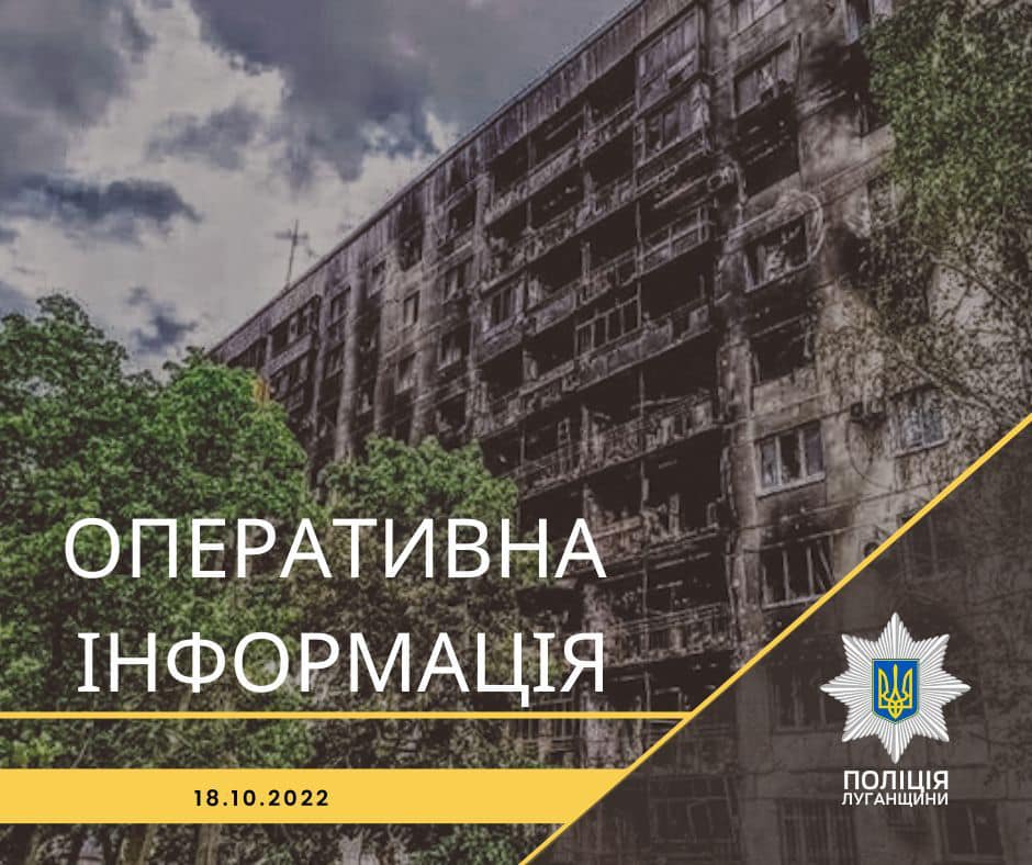 Протягом минулої доби, 17 жовтня, до поліції надійшло 10 повідомлень за фактом знищення або пошкодження майна громадян, внаслідок обстрілів окупаційними військами рф. У мешканців міст Попасна та Сєвєродонецьк зруйновані та пошкоджені квартири, господарчі споруди, гаражі.