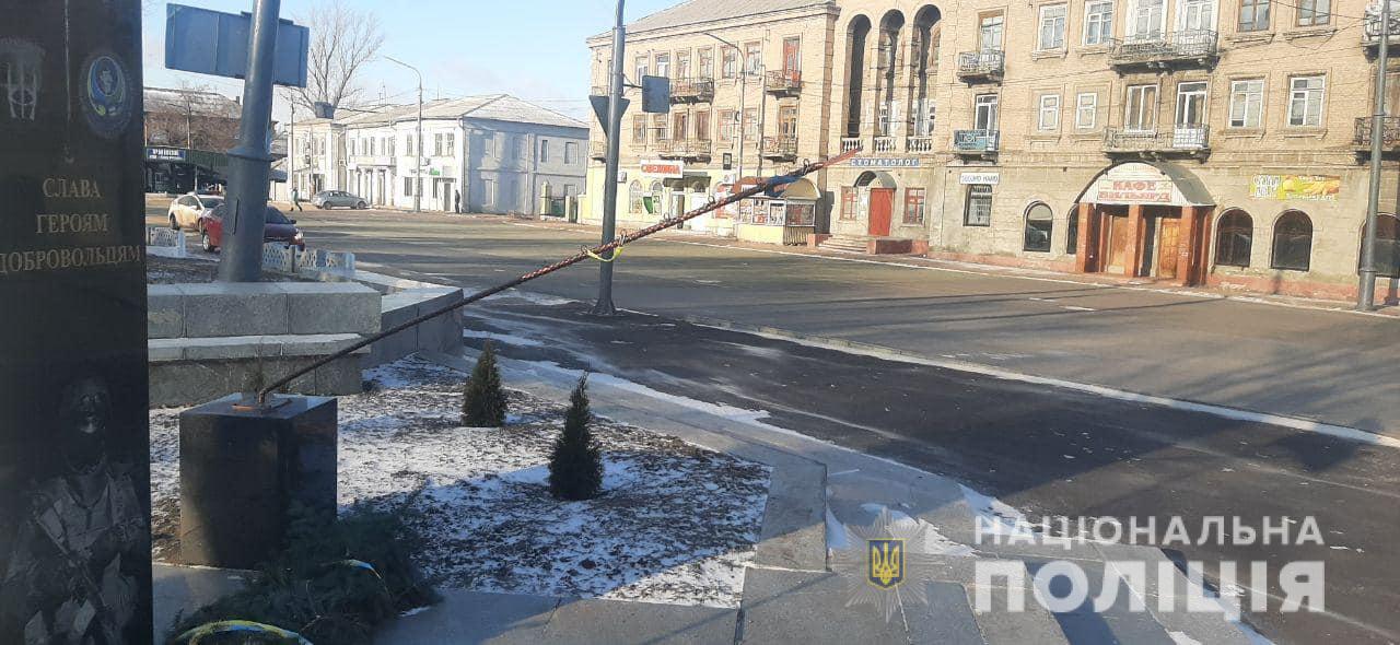 До поліції Лисичанська о 22.40 надійшло повідомлення про те, що невідомі пошкодили пам'ятник Героям добровольцям, який розташований на перехресті вул Червона та Жовтнева.