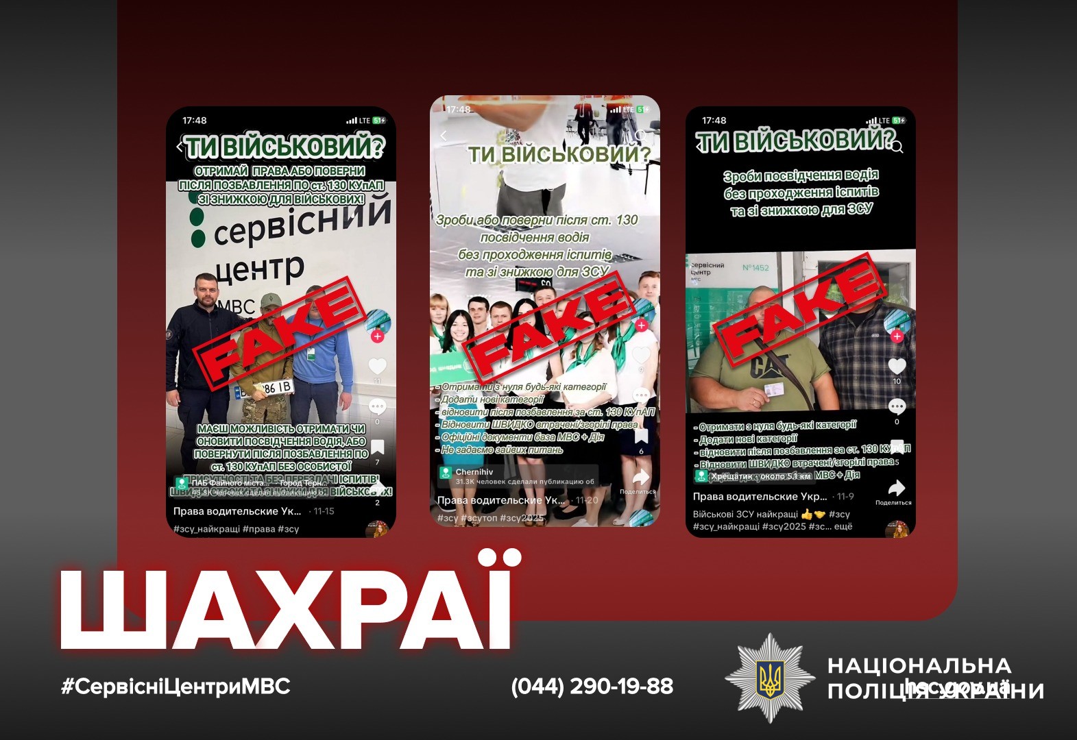 Шахраї використовують реальні фото військовослужбовців, які дійсно зверталися до сервісних центрів МВС, обіцяють знижки та спеціальні ціни військовим, запевняють, що посвідчення водія можна отримати онлайн та без складання іспитів, використовують фото публічних і відомих людей.
