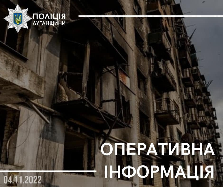Серед них 7 повідомлень про знищення та пошкодження, внаслідок обстрілів окупаційними військами рф, квартир та будинку у містах Сєвєродонецьк, Попасна, Лисичанськ та Рубіжне. У Сєвєродонецьку зруйновано крамницю та пошкоджено гараж. А в м. Рубіжне була знищена будівля підприємства. За даними фактами відкриті кримінальні провадження за ст. 438 КК України (Порушення законів та звичаїв війни).