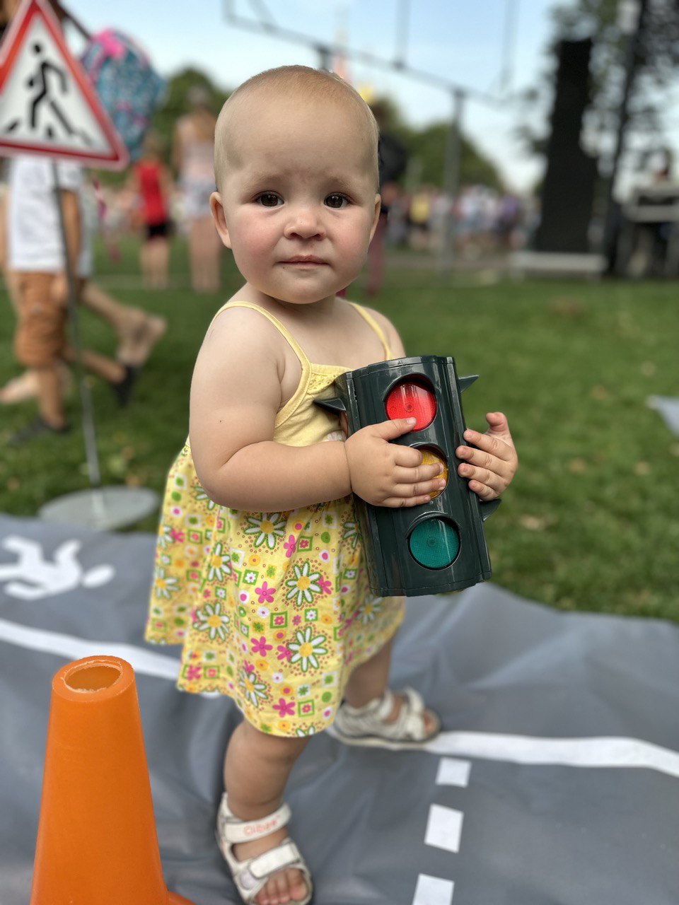 Поліцейські-ювенали нагадали правила дорожнього руху маленьким відвідувачам. Дітей ознайомили з тим, хто такий регулювальник на дорозі, навіщо він там треба та як правильно "читати" його сигнали. Під час гри дітлахи відчули себе регулювальником, пішоходом та автомобілістами.