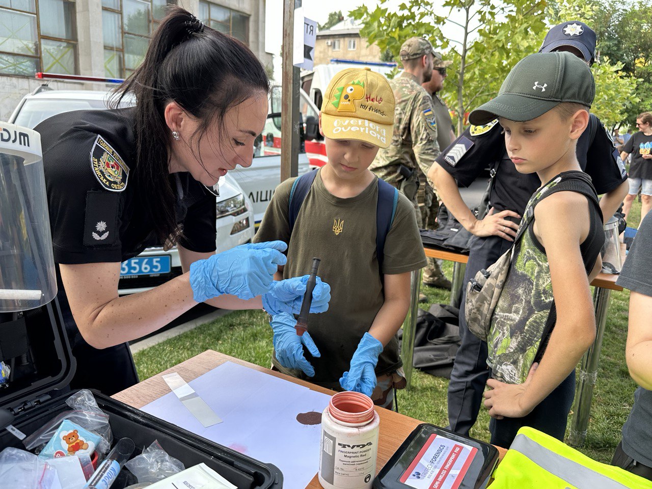 На локації експертів-криміналістів малечі розказали про тонкощі роботи зі слідами злочину на місці події та ознайомили з основними видами експертиз. Зі своєї криміналістичної лабораторії поліцейські дістали усе необхідне, щоб зняти відбитки пальців. Під пильним наглядом професіоналів малеча самостійно зафіксувала свої відбитки та забрали додому зразки своєї роботи.
