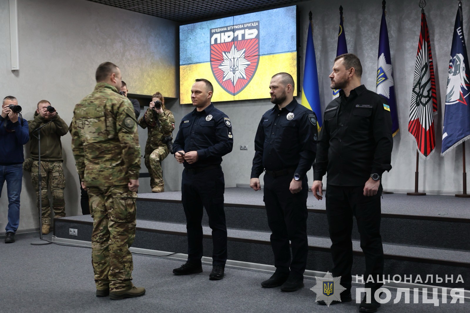 З нагоди річниці створення Департаменту поліції особливого призначення «Об’єднана штурмова бригада Національної поліції України «Лють», що боронить країну від російських загарбників, Міністр внутрішніх справ України Ігор Клименко та Голова Нацполіції Іван Вигівський вручили поліцейським відомчі відзнаки та спеціальні звання.
