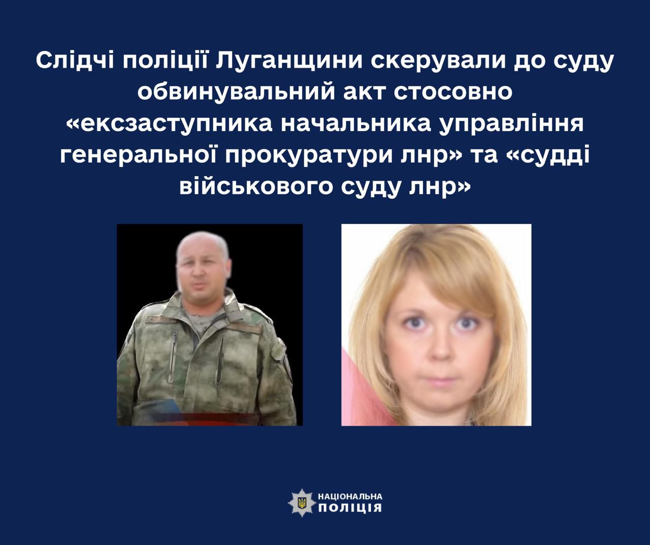 Слідчі поліції Луганщини скерували до суду обвинувальний акт стосовно «ексзаступника начальника управління генеральної прокуратури лнр» та «судді військового суду лнр»