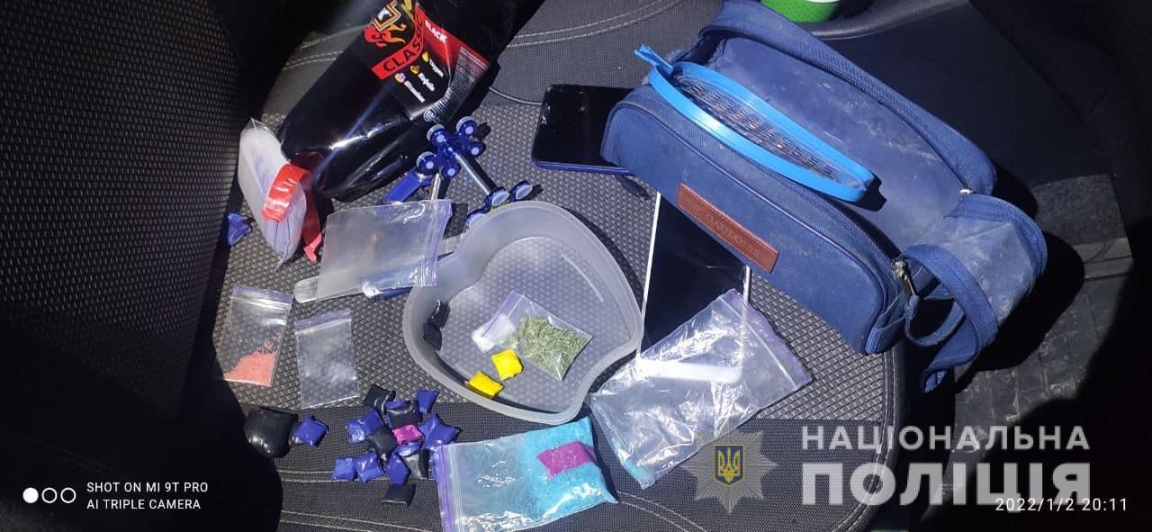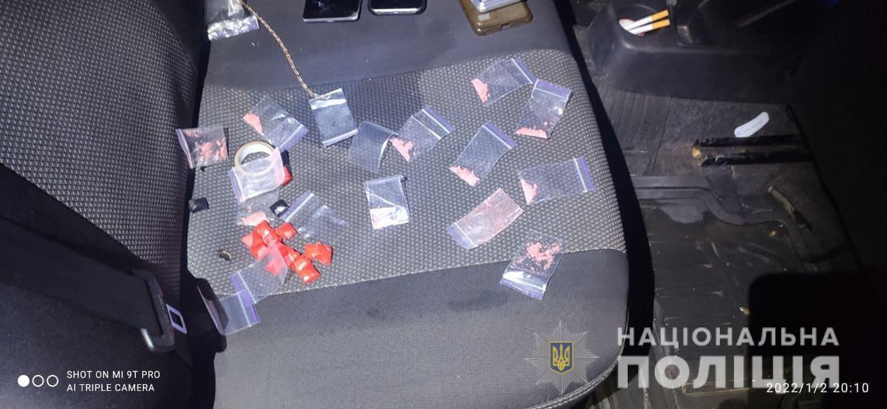 Під час перевірки документів та спілкування з водієм та пасажиром правоохоронці помітили в автомобілі згортки з кришталеподібною речовиною.
