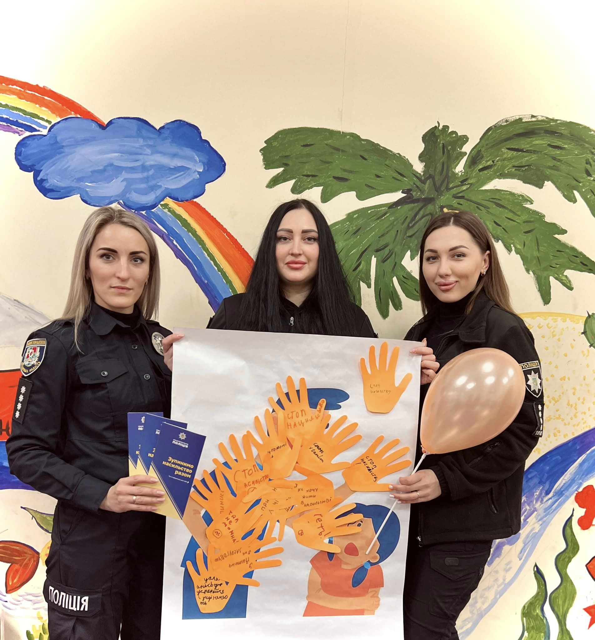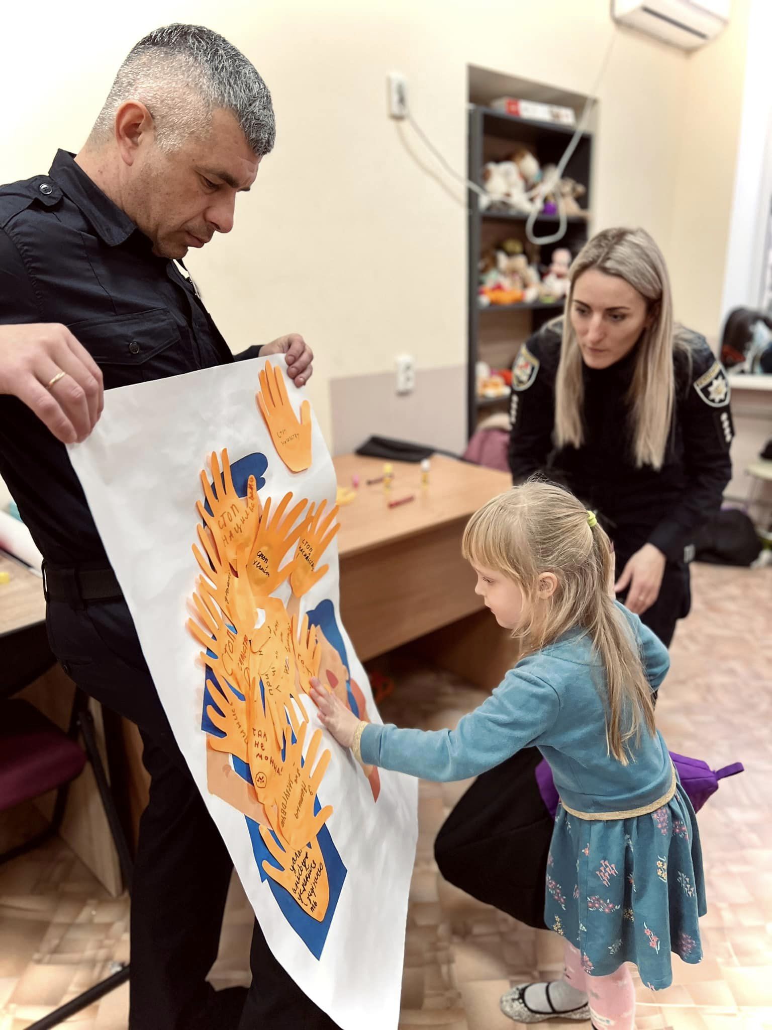Разом з дітьми правоохоронці наочно відпрацювали техніку протидії домашньому насильству, імітуючи відсіч кривднику. Для цього дітям роздали паперові долоньки та запропонували закрити намальованого на ватмані кривдника, який проявляє агресію відносно дитини. Кожна паперова долонька – це правильний емоційний посил проти агресора, дитяча протидія та захист.