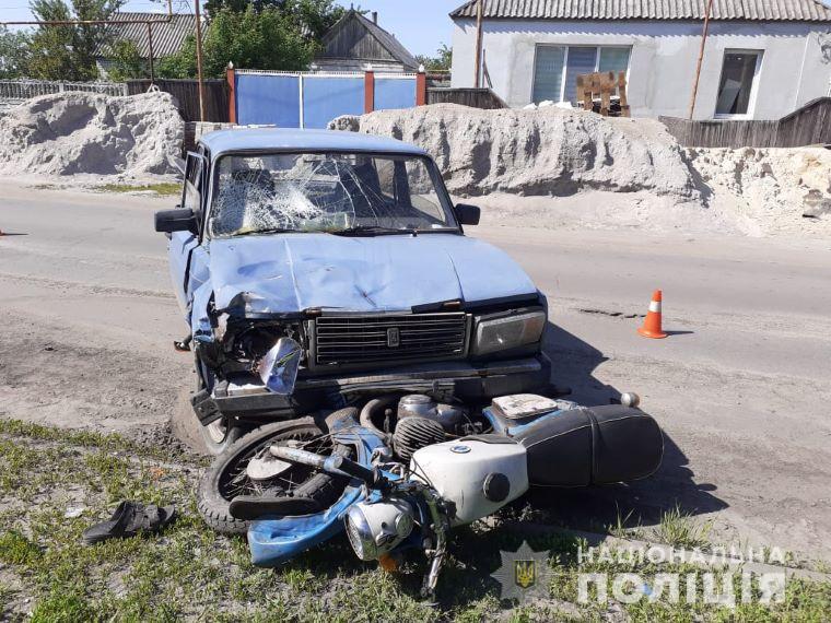 Вчора, близько 14-ї години 20-річний водій мотоциклу ВЖГ, не маючи водійського посвідчення, з 22-річним пасажиром рухався на вказаному транспортному засобі по вул. Центральній. Під час виконання маневру, водій виїхав на зустрічну смугу, не впорався з керуванням та допустив зіткнення з автомобілем ВАЗ 2107 під керуванням 49-річного місцевого мешканця.
