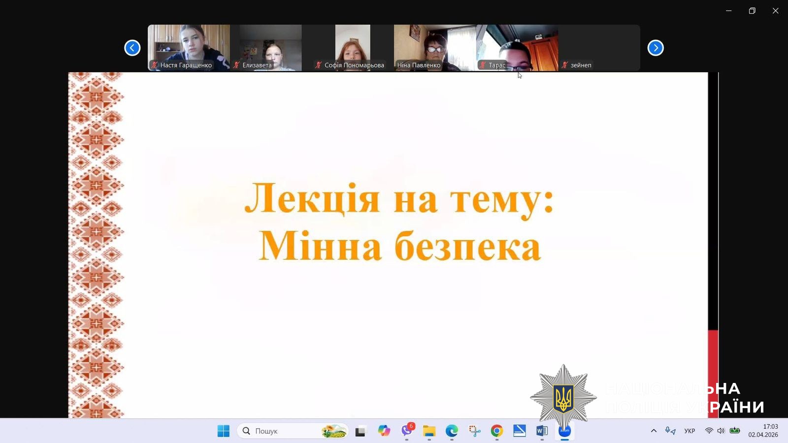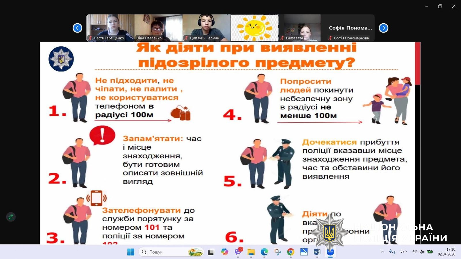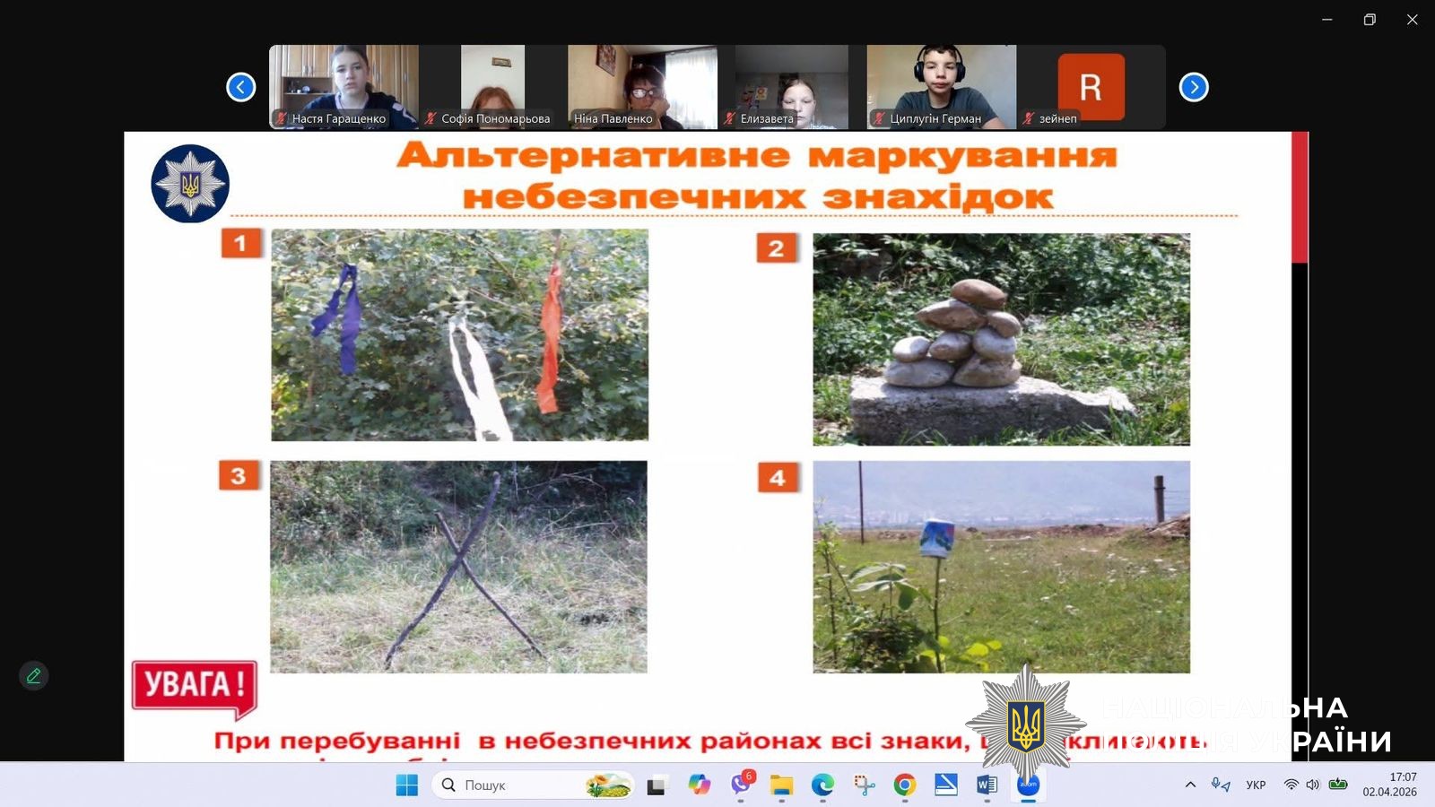 З нагоди Міжнародного дня просвіти з питань мінної безпеки ювенальні поліцейські Луганської області провели серію онлайн-уроків для учнів закладів загальної середньої освіти.