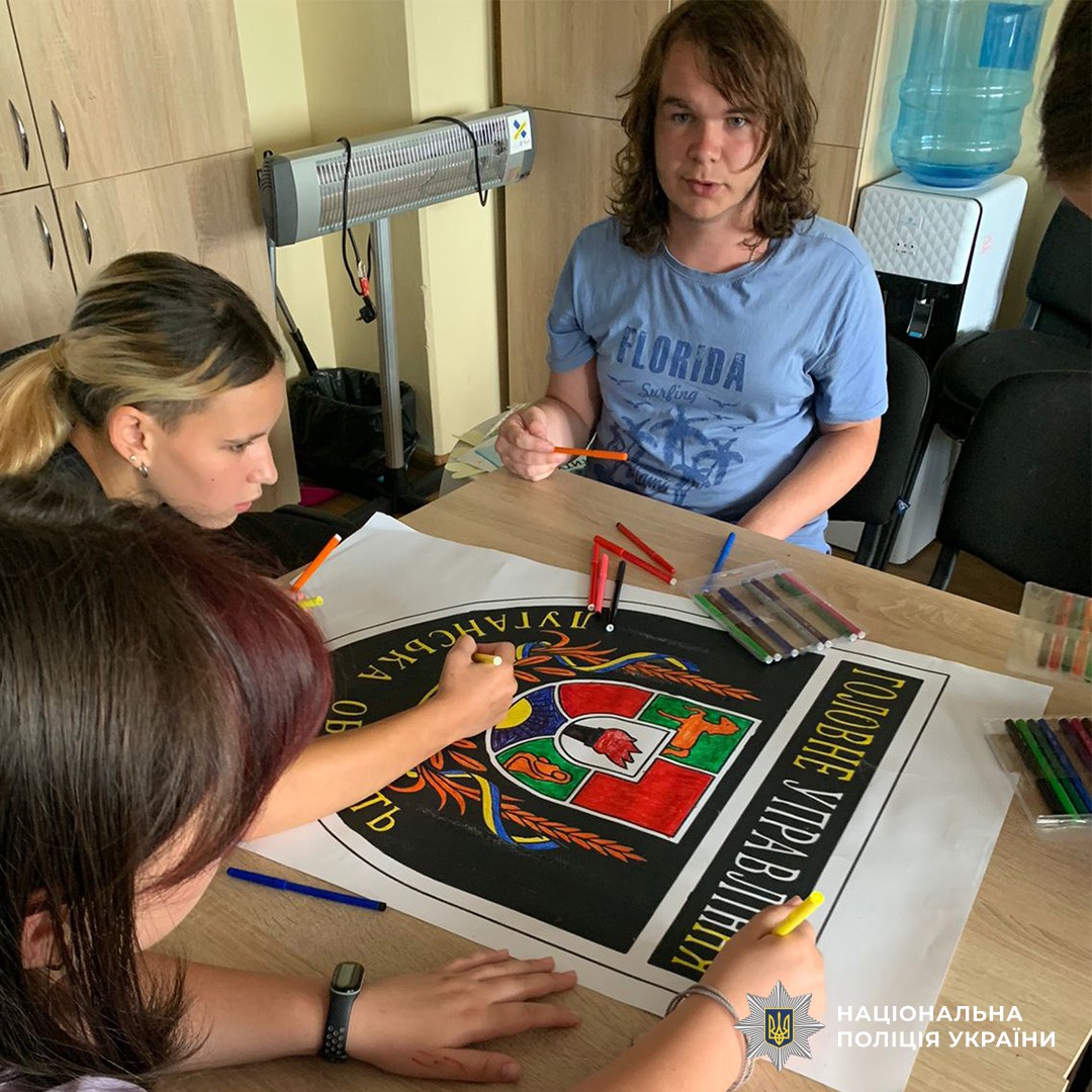 Після пізнавальної частини діти разом із поліцейськими взяли участь у творчому патріотичному занятті. На великому аркуші паперу був надрукований шеврон поліції Луганської області, в центрі якого — герб рідної Луганщини. Учасники заходу спільно розмалювали символ, вкладаючи у кожен штрих тепло своїх спогадів про рідний дім. Герб області, що містить елементи різних районів Луганщини, став своєрідним містком між сьогоденням і домівкою, яку довелося залишити через війну.